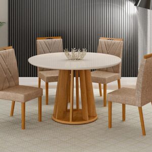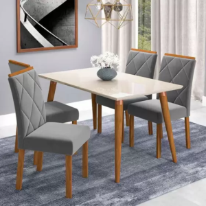 Mesa Adele 1,30 – Madeira/Off White + 4 Cadeiras Fernanda – Madeira/Joli Cimol